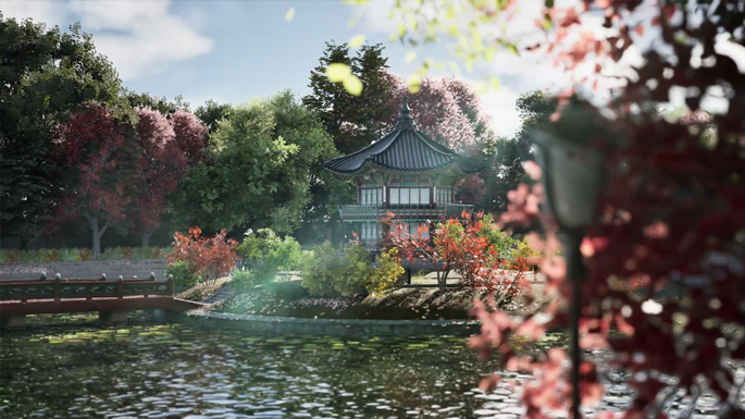 언리얼엔진 작품은 고요하고, 평화로운 경복궁 향원정의 다채로운 모습을 표현하였습니다.