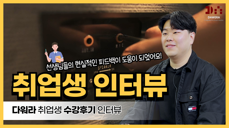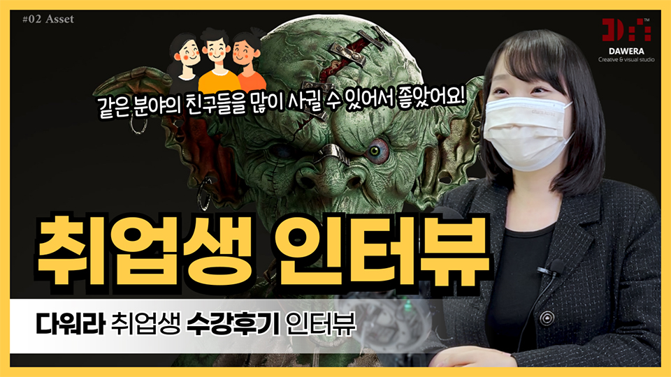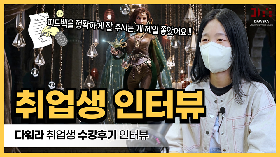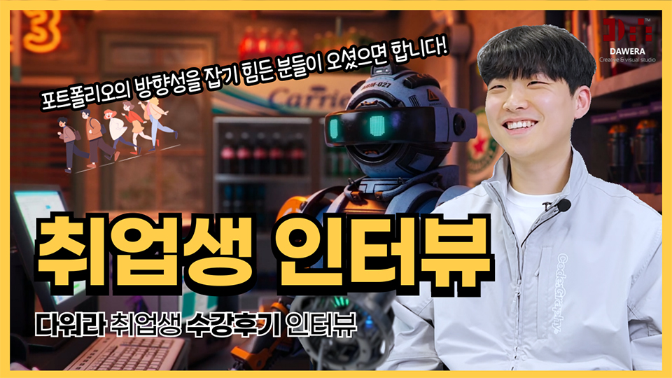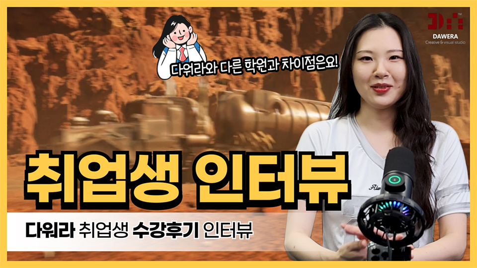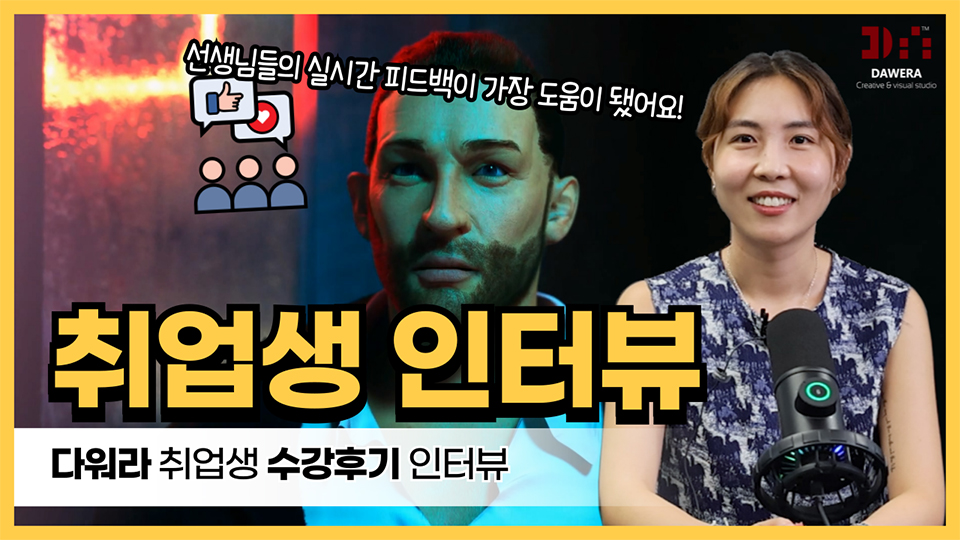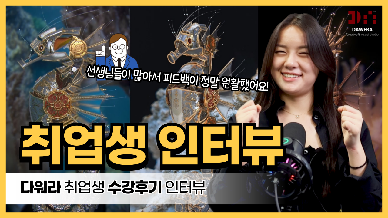 타 학원에서는 하나의 파트를 선택하고, 최소 3개월 이상의 기초반 과정을 수료해야 했었는데, 기획부터 합성까지 모든 과정이 담긴 포트폴리오를 제작할 수 있어서 이 학원을 선택하게 되었습니다.