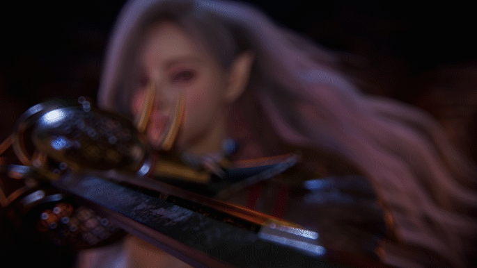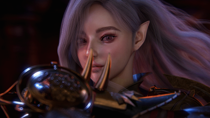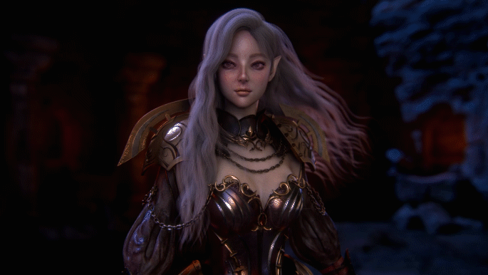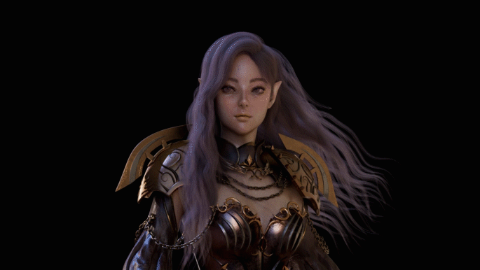 흩날리는 보랏빛 머리와 뚜렷한 이목구비가 인상적인 전사입니다.
