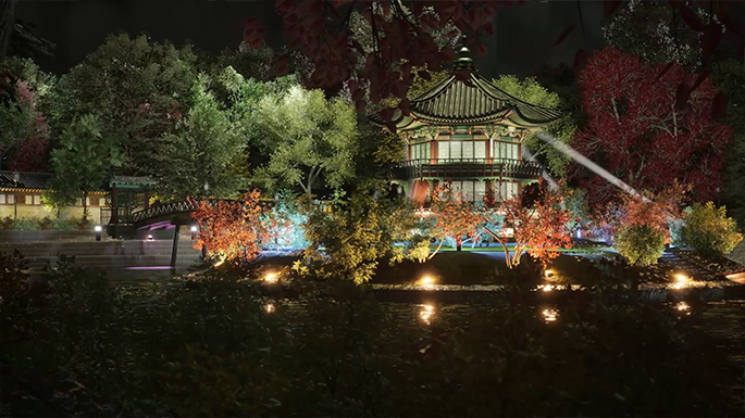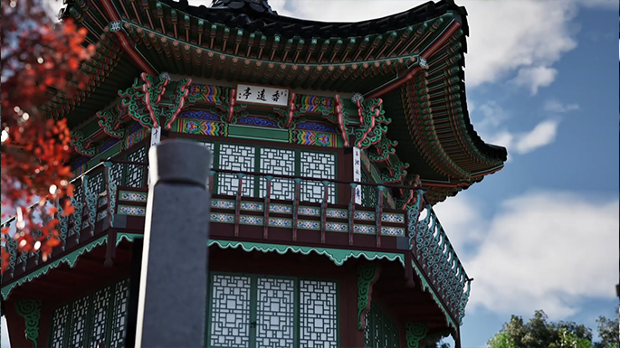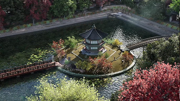 언리얼엔진 작품은 고요하고, 평화로운 경복궁 향원정의 다채로운 모습을 표현하였습니다.